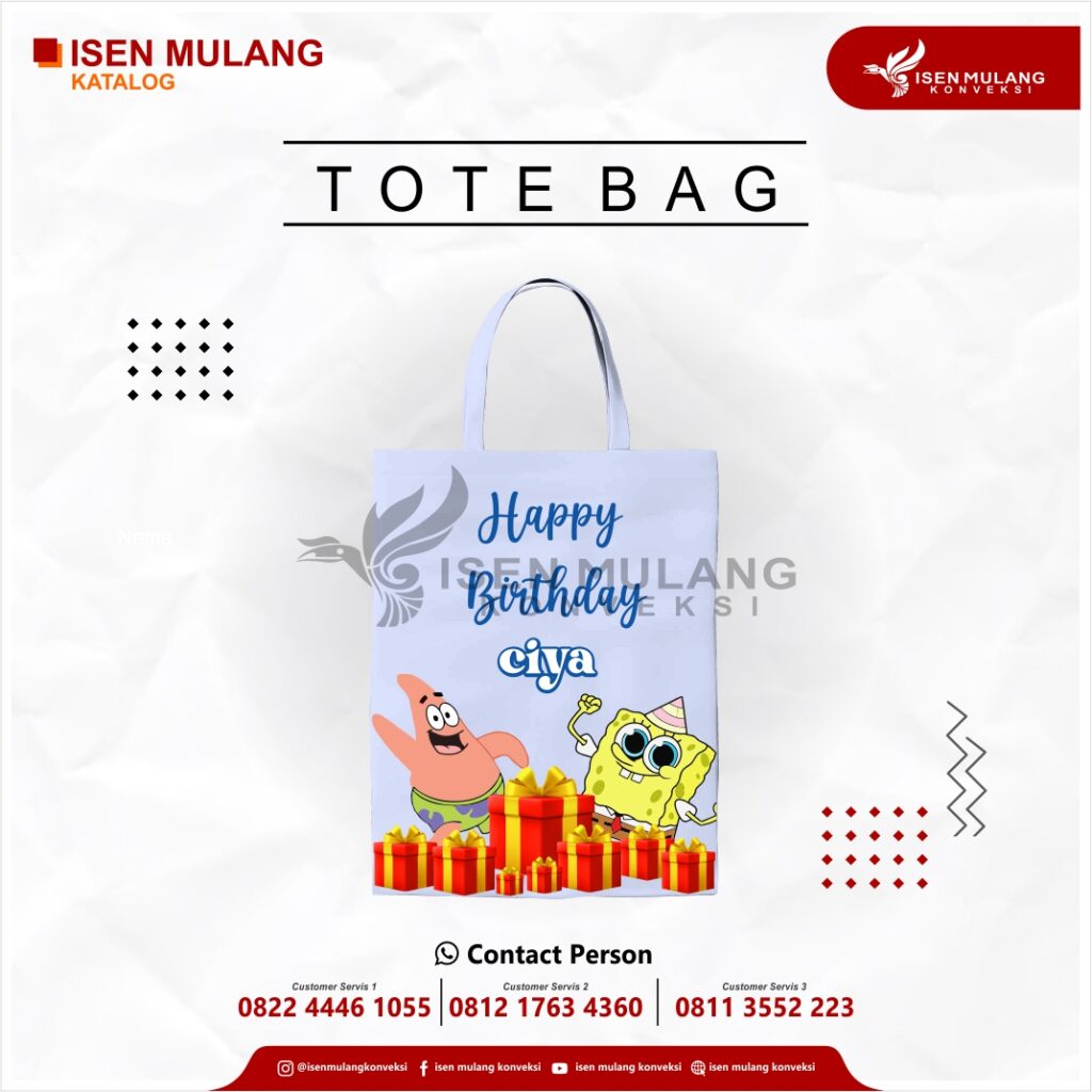 Totebag merupakan salah satu model tas jinjing berbentuk kotak dan terbentuk kotak dan terbuka yang dilengkapi dengan dua buah tali peganggan pada bagian atasnya. Sesuai fungsinya dan tujuan pemakaian tote bag sendiri tersedia dalam berbagai macam desain dan ukuran . mulai dari tote bag berukuran besar,totebag berukuran sedang dan kecil.