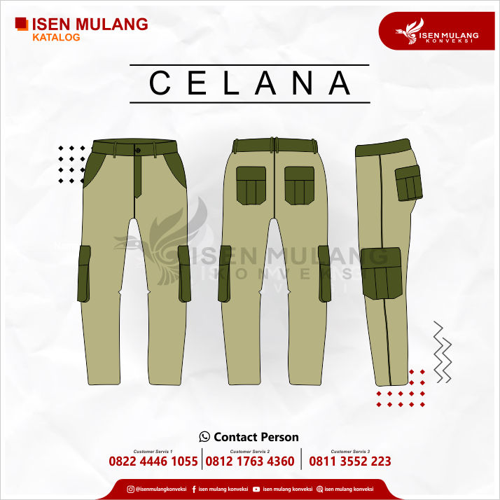 Di atas adalah penjelasan tentang bahan bahan yang biasa dipakai untuk celana cargo. sudah cukup jelas, kan? mungkin setelah membaca ini, kalian ingin membuat celana cargo sendiri? Jagonya Bikin Seragam bisa membantu kalian, loh! Isen Mulang adalah jasa konveksi yang mencakup jasa jahit dan jasa sablon. Kami siap menjadi vendor terpercaya kalian. Punya pertanyaan dan tertarik membuat pakaian di ISEN MULANG KONVEKSI Langsung saja menghubungi Customer Servis di bawah ini :